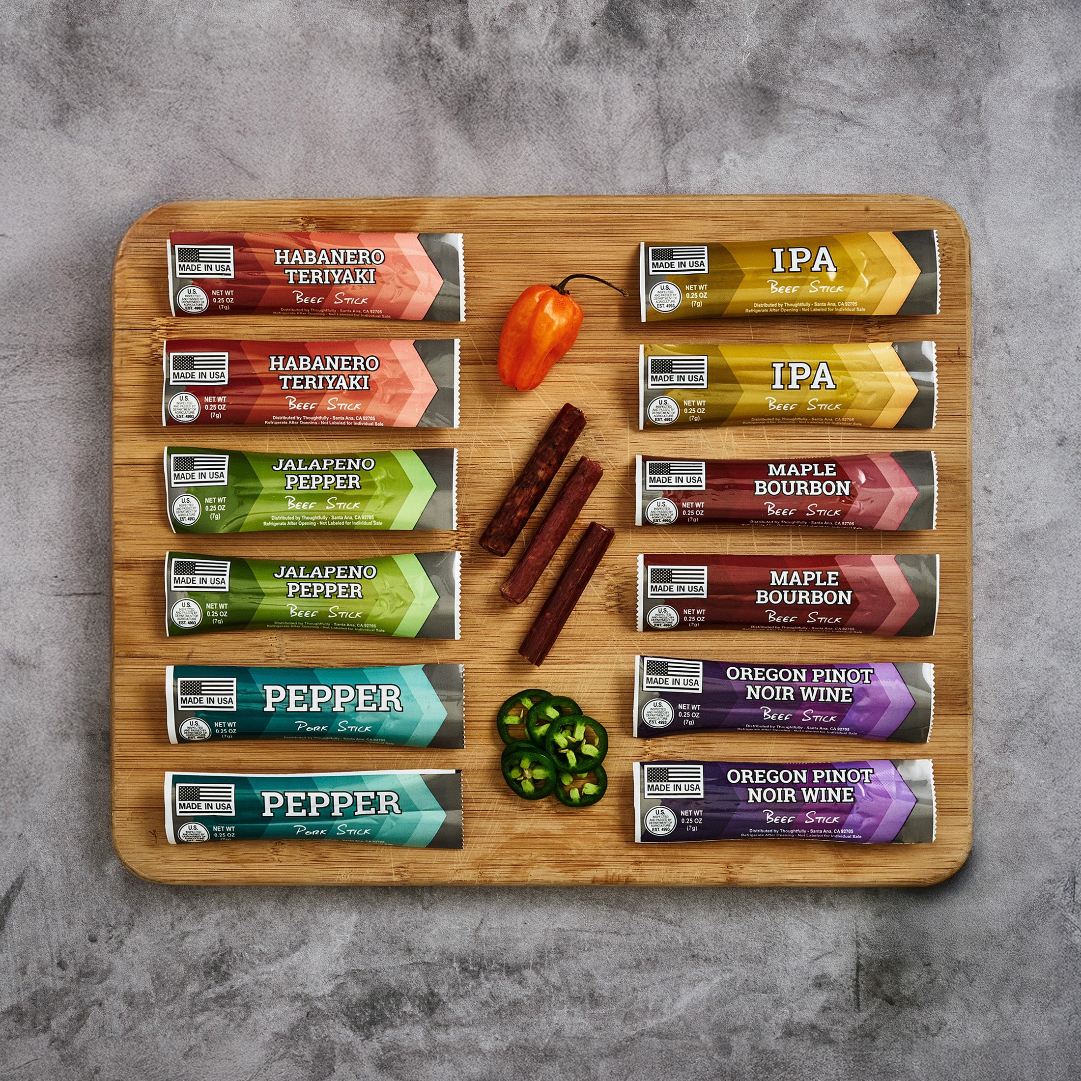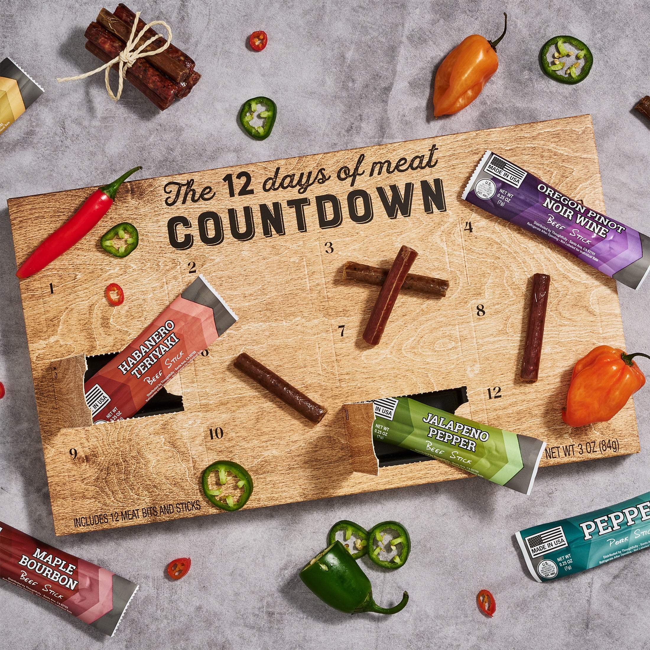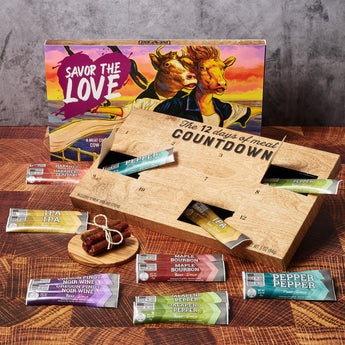 Each of the 12 windows holds a small piece of jerky that will remind him of the milestone ahead. From Maple Bourbon to Habanero Teriyaki, every day reveals a new savory surprise. And with every bite, he'll think of you and the special moment you’re counting down to together.