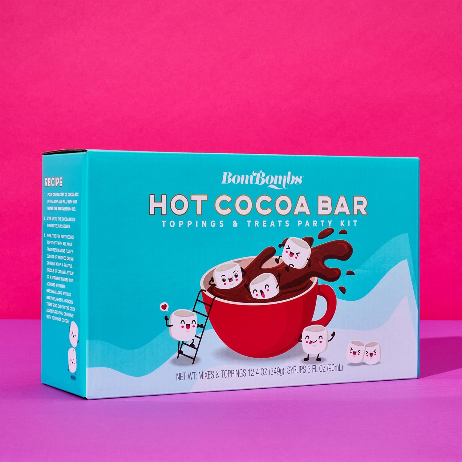 Create cozy memories with our BomBombs Mini Hot Cocoa Bar, featuring four rich and creamy hot cocoa mix flavors—Milk Chocolate, Salted Caramel, French Vanilla, and Cookie Butter—plus a delicious assortment of toppings to garnish your cup. This all-in-one set includes mini cups, printed sleeves, fluffy marshmallows, and other fun mix-ins to make every sip special. Perfect for hot cocoa lovers, sleepovers, holiday parties, or Christmas gifting, this festive set brings warmth and joy to any occasion. Gift bag ready, simply wrap it up, add a bow, and your hot chocolate gift set is ready to go!