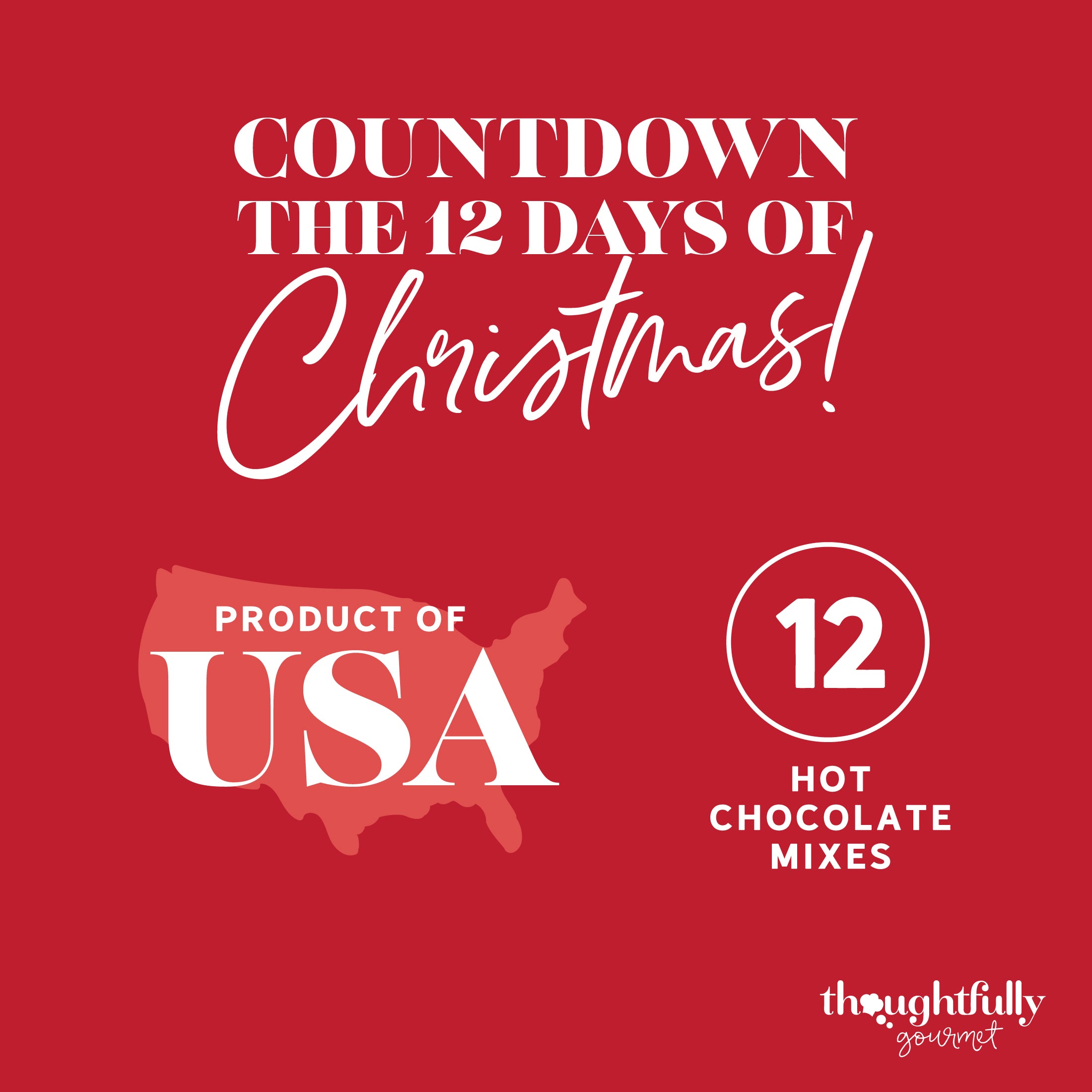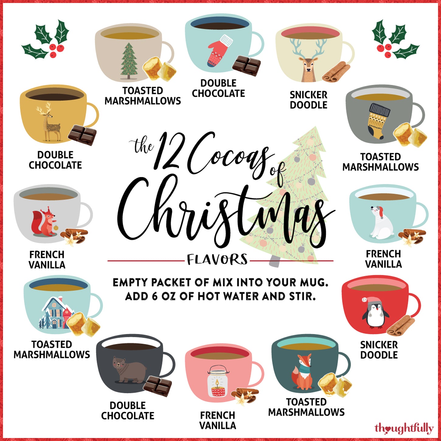 Stay happy and warm this holiday season with our Cocoas of Christmas hot chocolate gift set. Each festively packaged hot cocoa gift set comes with 12 individually packaged USA hot cocoa flavors to help you count down the days to Santa’s arrival. From classic gourmet hot chocolate flavors like Double Chocolate and French Vanilla to unique, foodie flavors like Pumpkin Pie, Amaretto and Caramelized Bacon this the ultimate collection of Christmas hot chocolate.