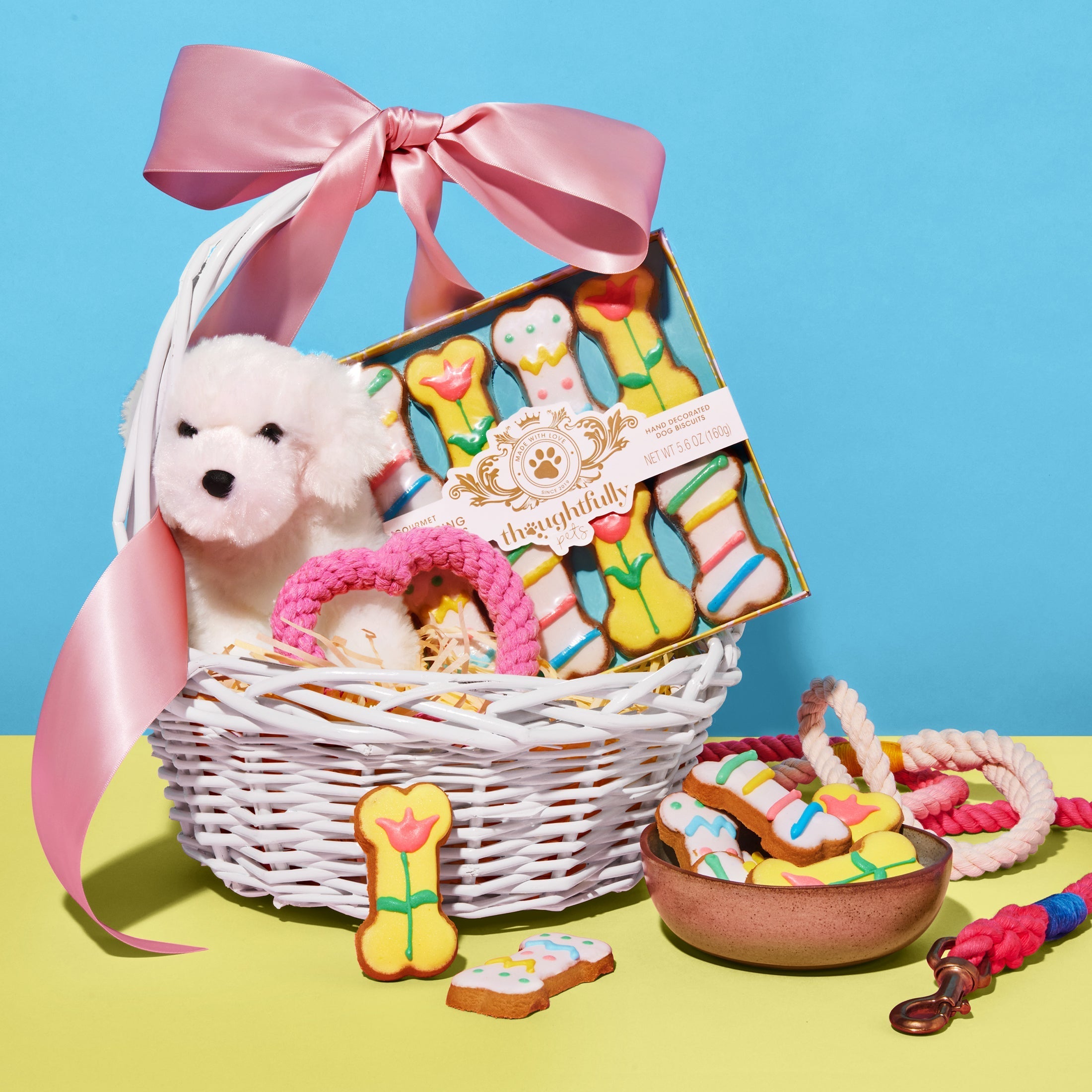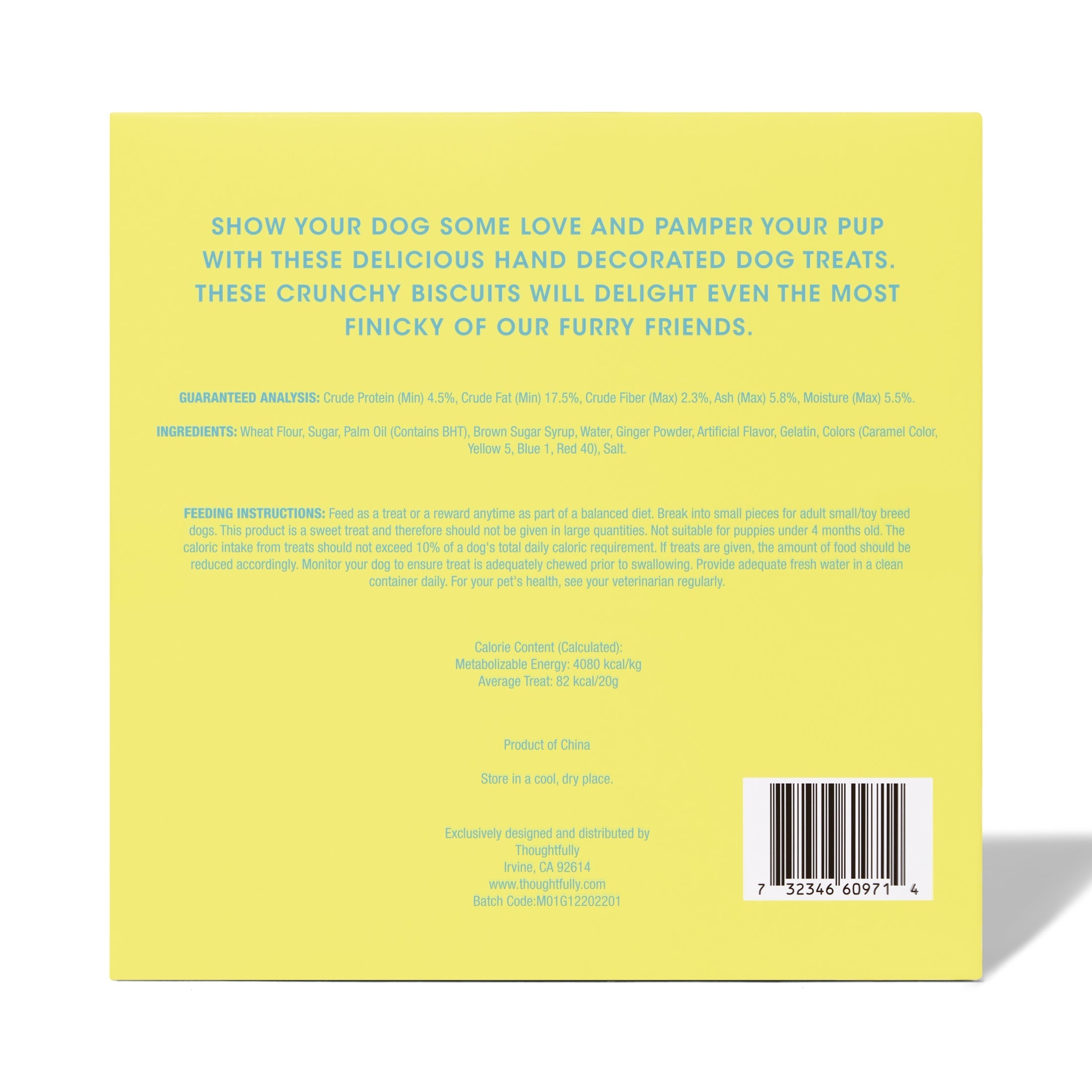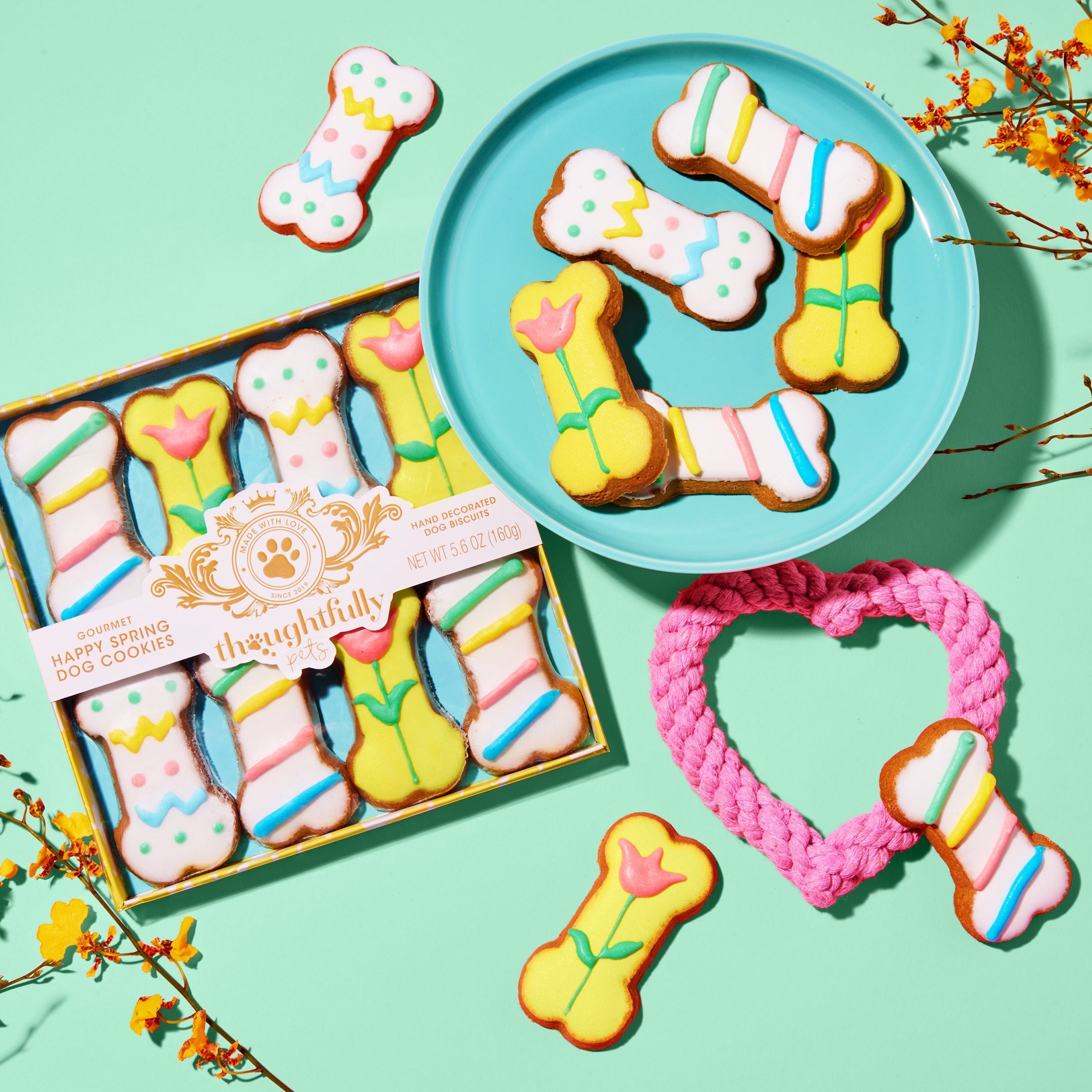 Pamper your pup with a selection of Happy Spring Dog Cookies from Thoughtfully Pets. Each box includes 8 peanut butter-flavored crunchy biscuits that will delight even the most finicky of our furry little friends. Made from human grade ingredients, these hand-decorated dog cookies have a Springtime theme that makes them perfect for Easter Dog Gifts, dog birthdays, or rewarding and training all season long.