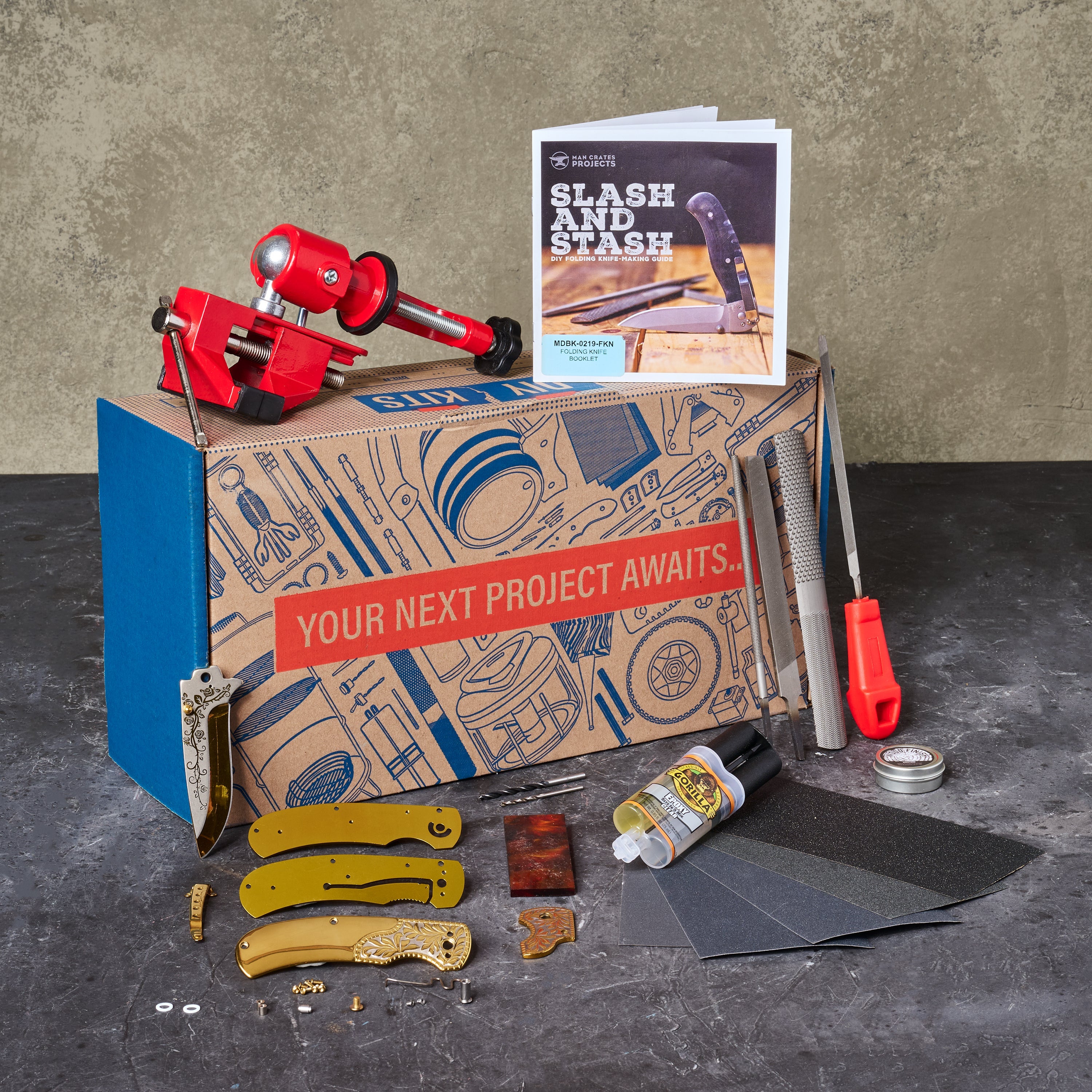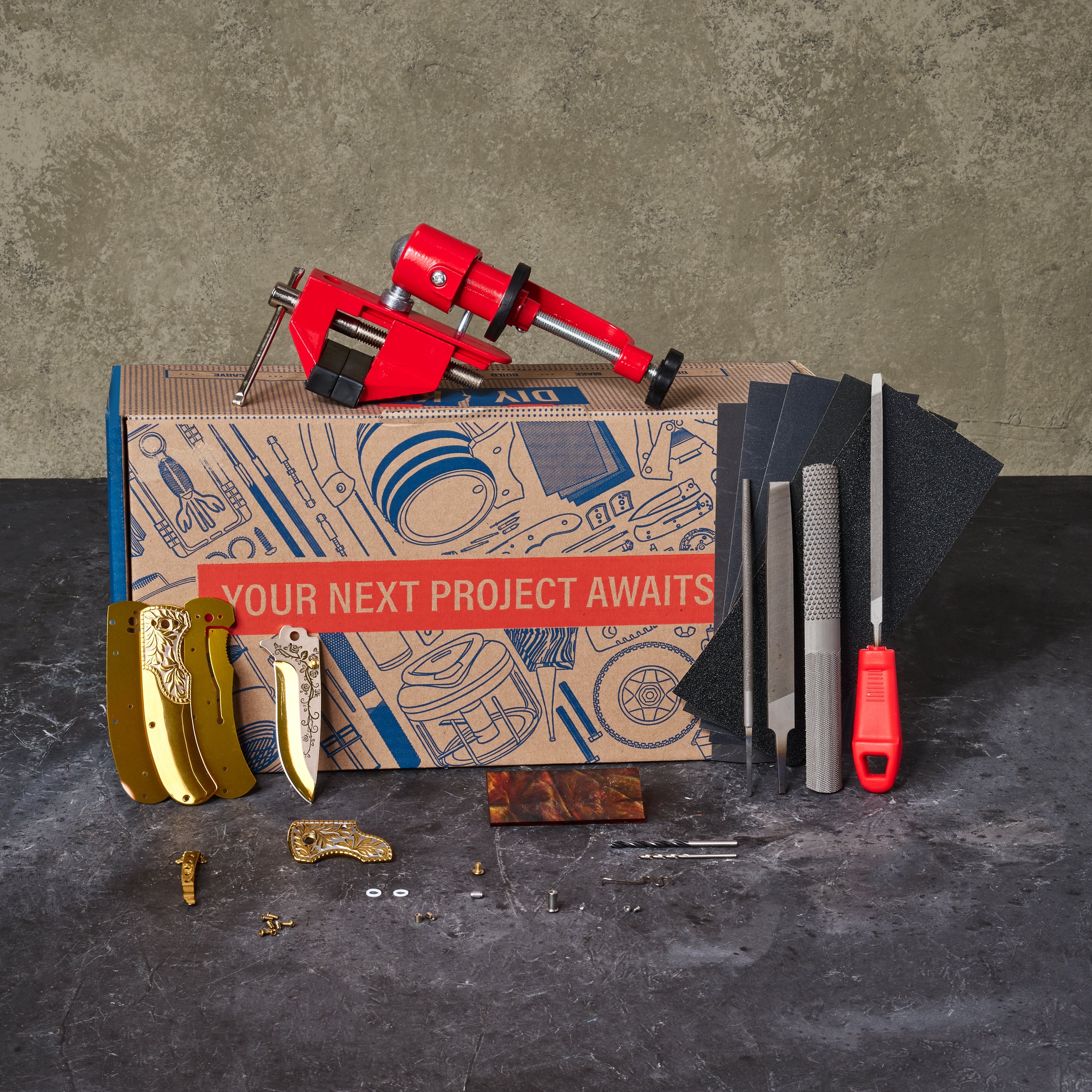 We've also included a portable bench vise, file, and rasp set, sandpaper, and Torx wrenches for assembling and shaping the knife handles to its perfect, palm-fitting specifications, as well as an instruction booklet to make sure the knife gets assembled pointy end out.