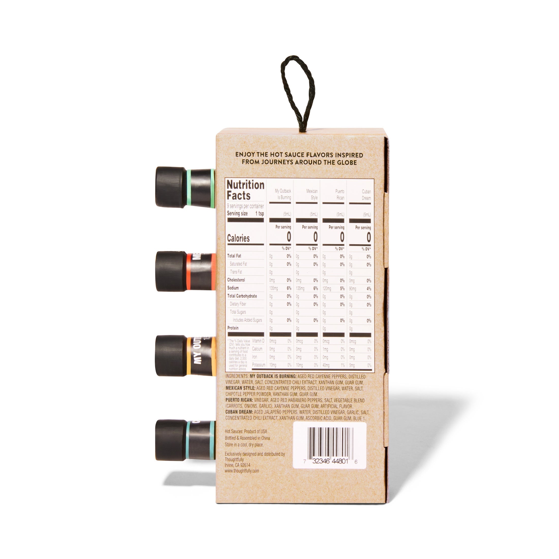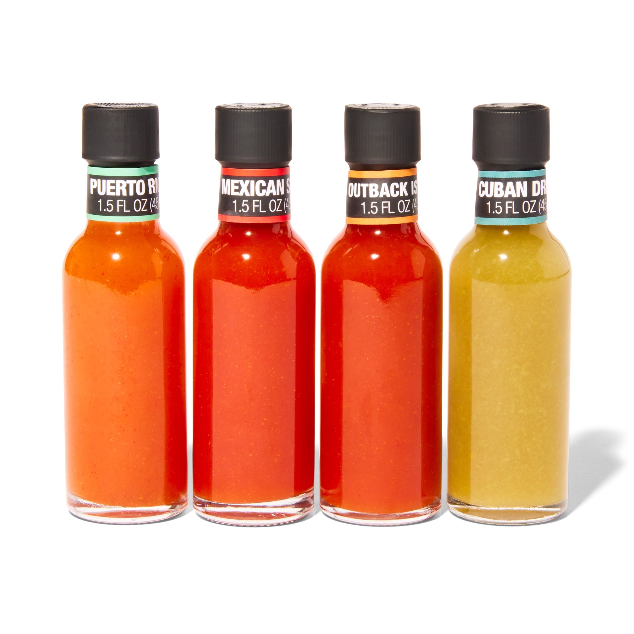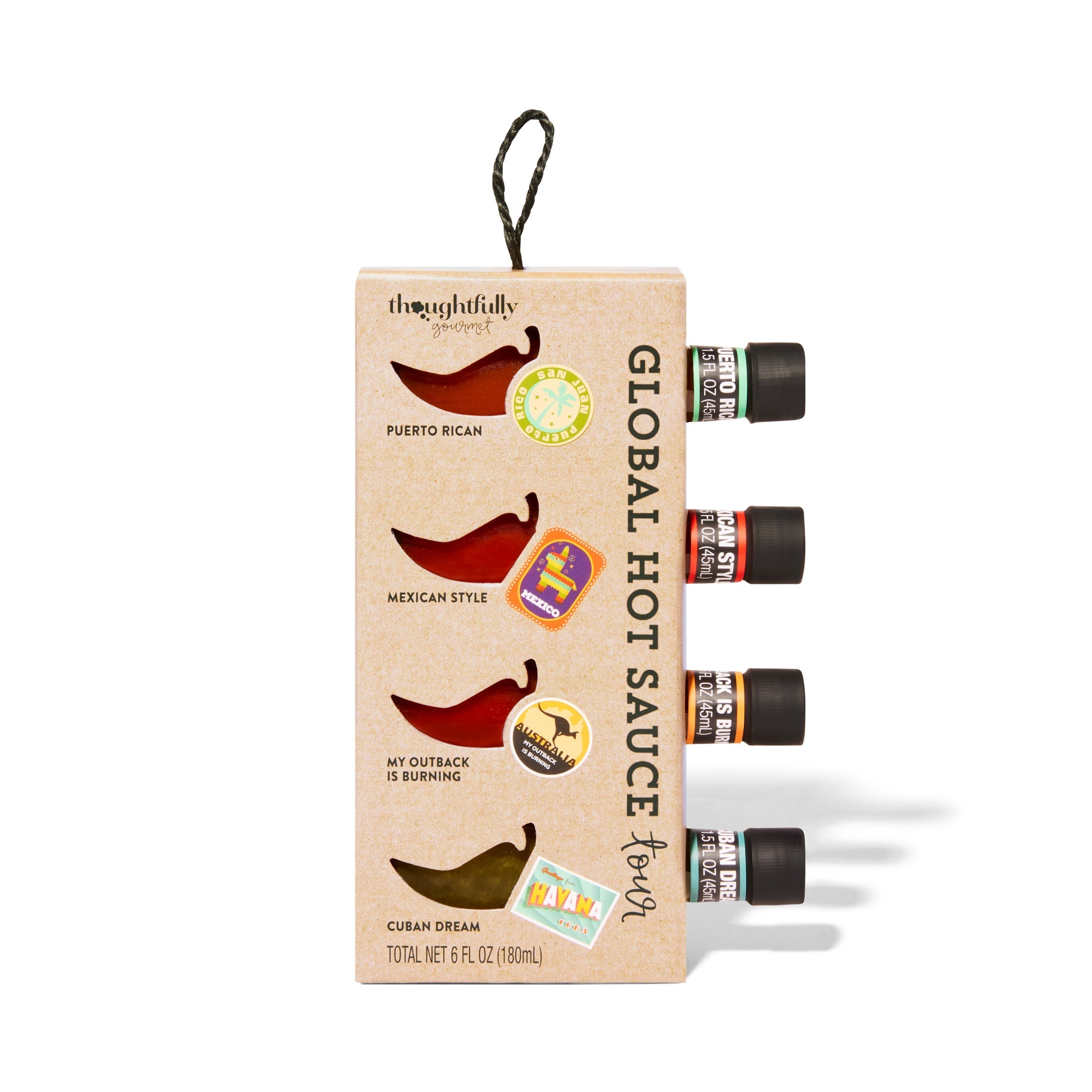Turn up the heat with a unique collection of hot sauces from around the world. This global-inspired hot sauce gift set delivers robust, full flavors to your favorite foods with fiery fun USA hot sauces like Cuban Dream Green, Puerto Rican Mango Habanero, Mexican Style, and My Outback Is Burning Orange. A devilishly delicious hot sauce sampler that makes an excellent hot sauce gift for friends and family.