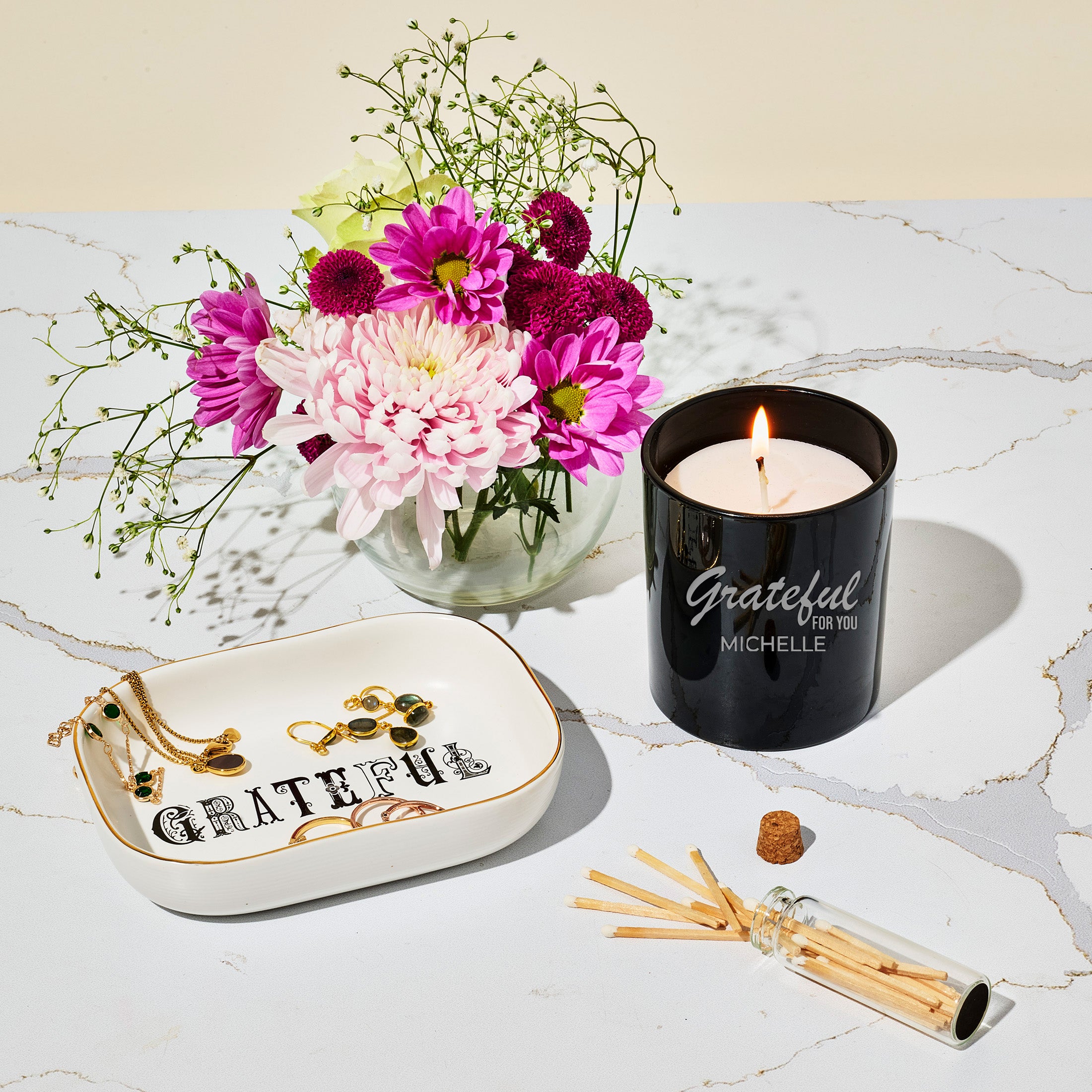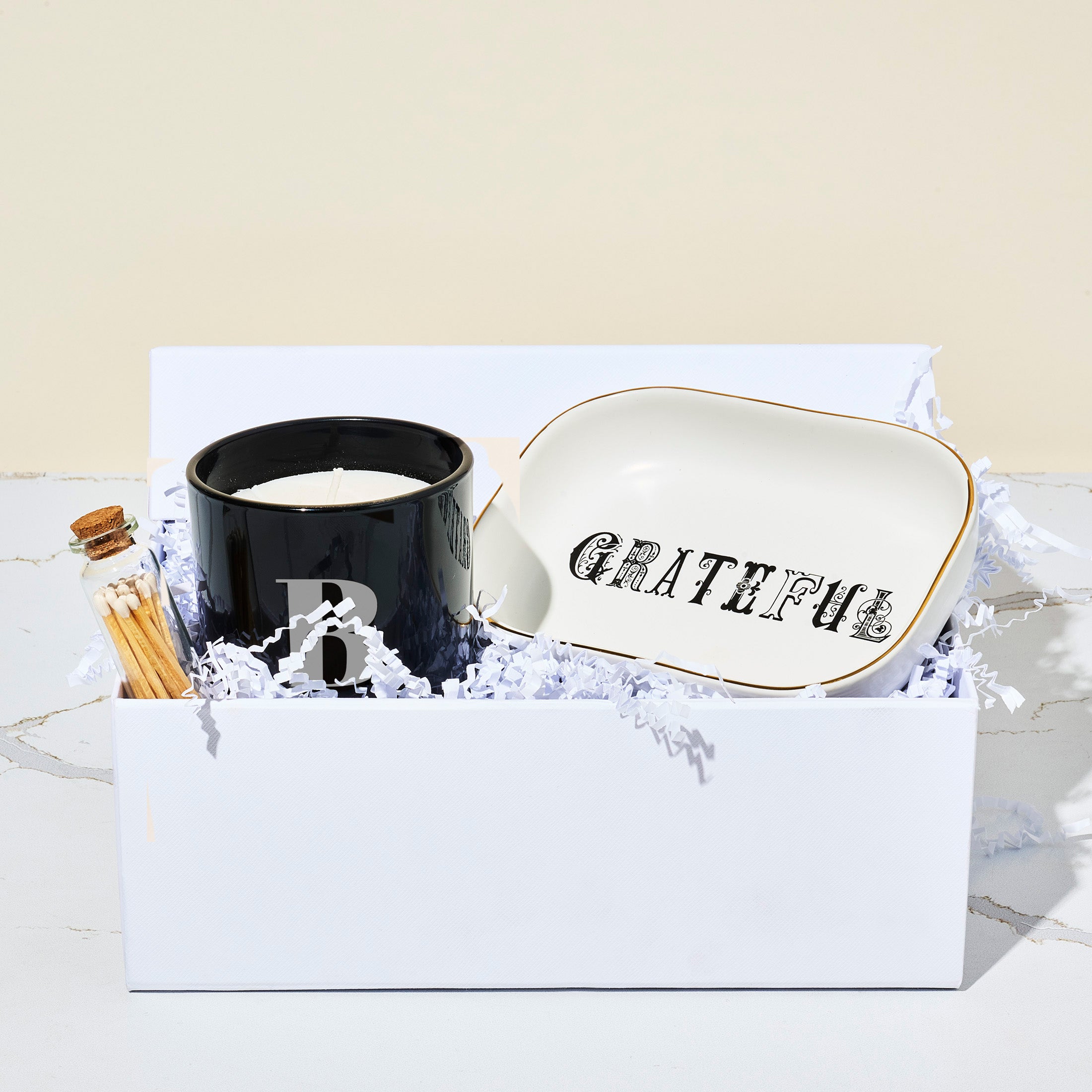 Gratitude is always in season, and research shows that it's as beneficial to those who give it as to those they appreciate. The elegant personalized black glass candle adds a lasting impression. The porcelain trinket tray can be used as a catchall for keys or jewelry, or for display. And the champagne bears provide a delicious treat for the lucky recipient of this gift.