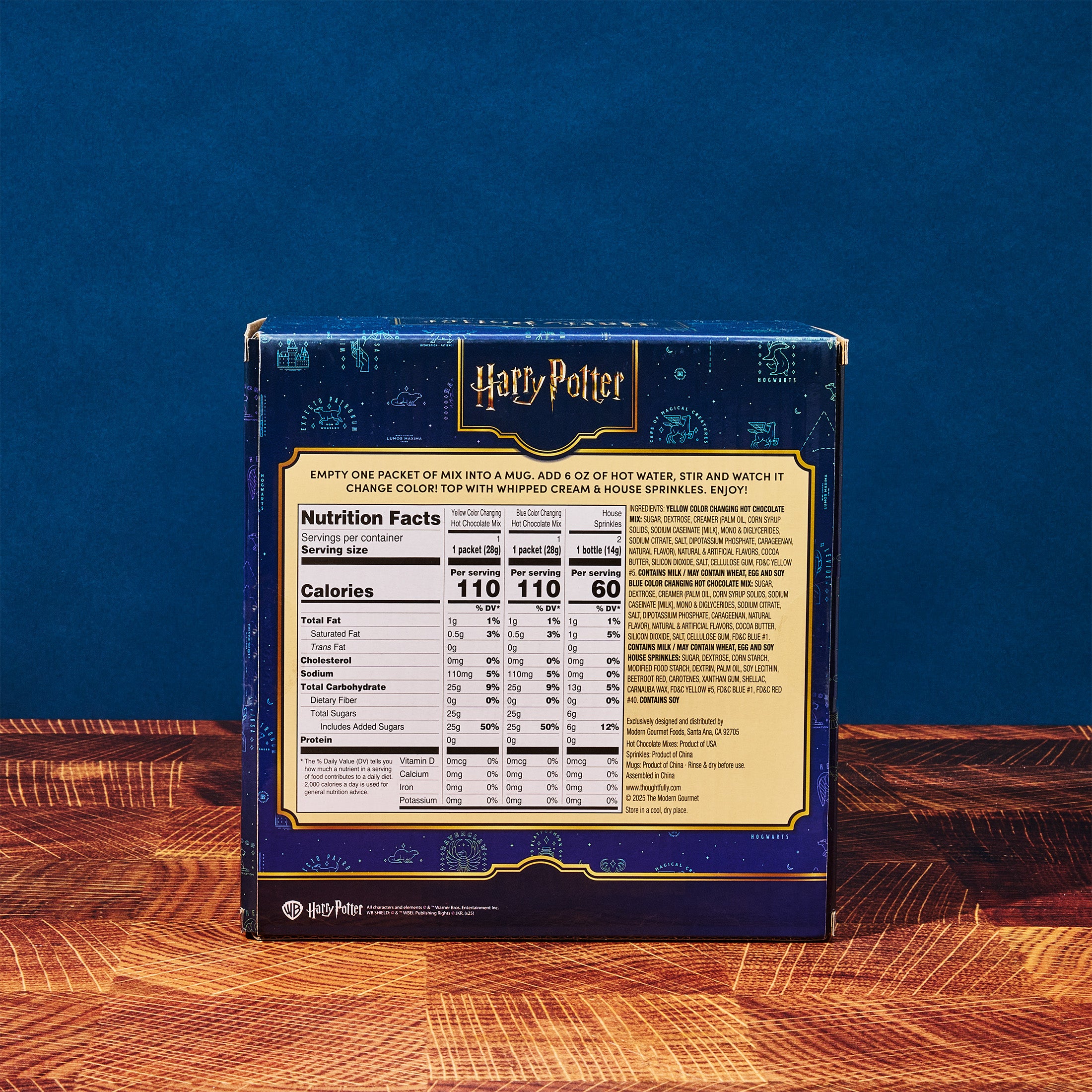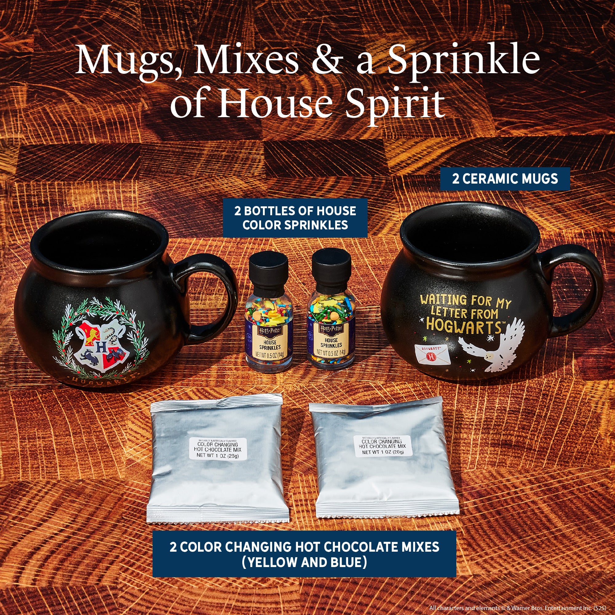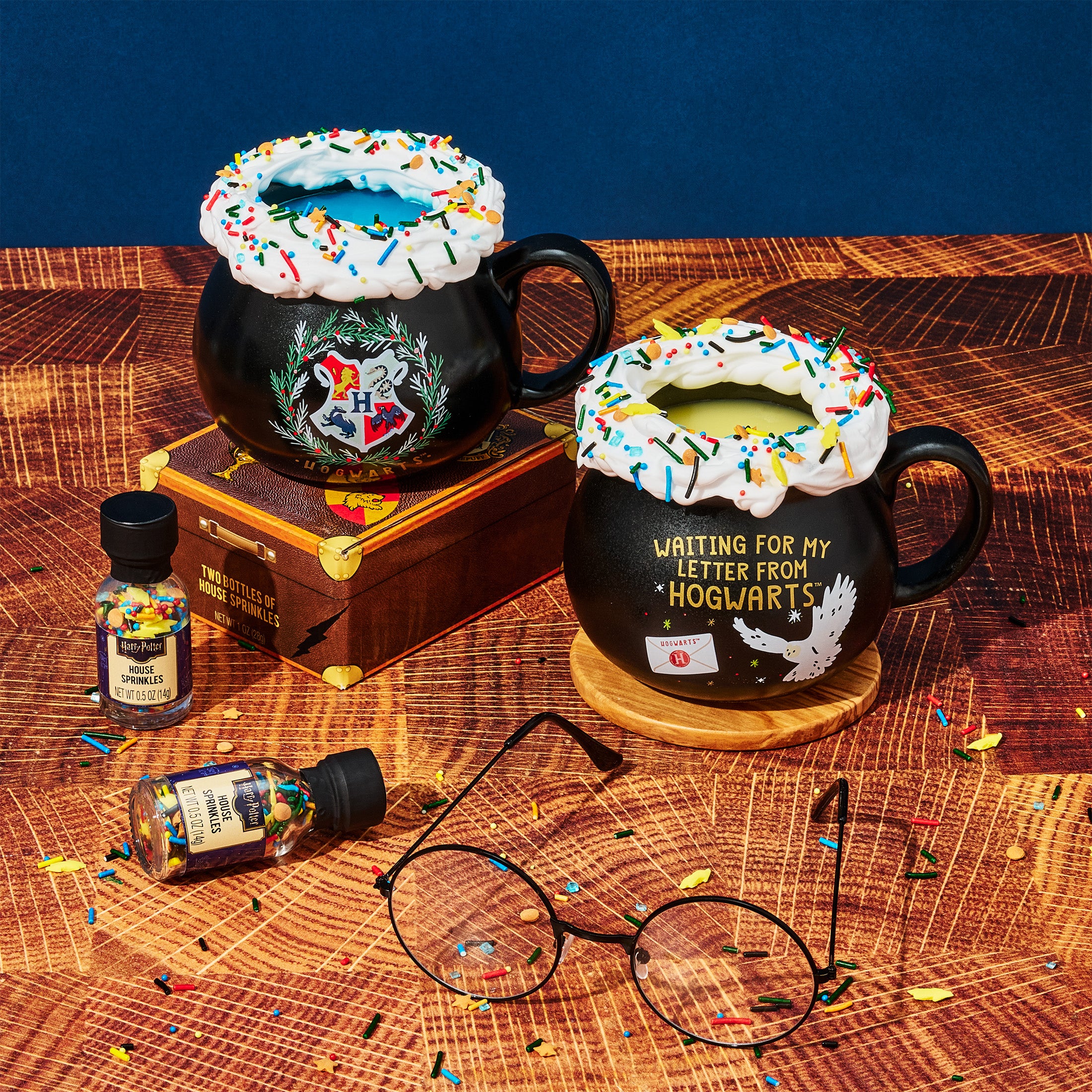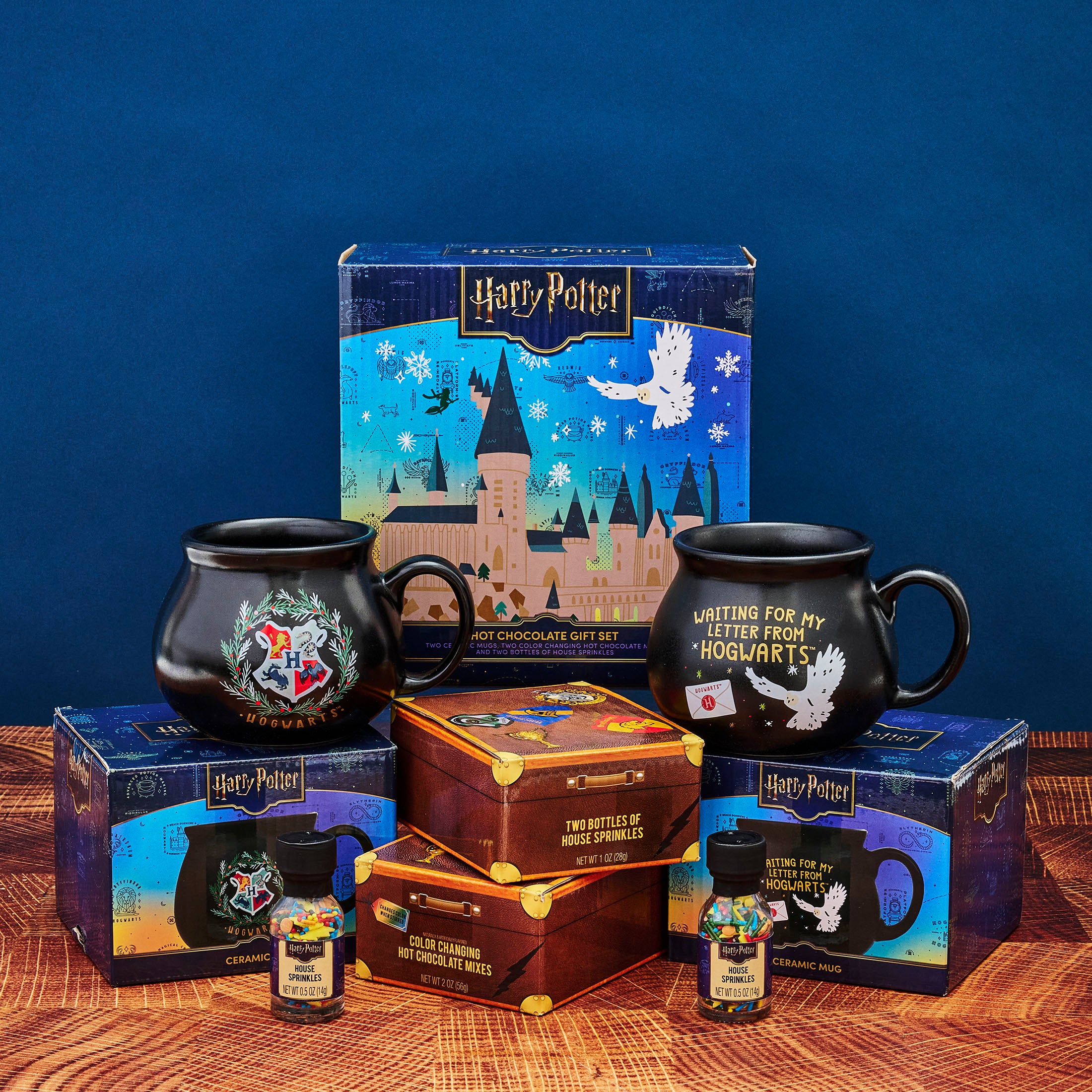Experience the magic of HARRY POTTER like never before. This hot chocolate gift set comes with a pair of cauldron shaped mugs, HARRY POTTER color changing hot chocolate (yellow and blue), and two jars of HARRY POTTER-themed sprinkles. It’s a HARRY POTTER gift set for two that’s full of colorful wizarding wonder and decadent gourmet hot chocolate. Beautifully packaged in a Harry Potter gift box, this is an outstanding gift for fans of HARRY POTTER.
