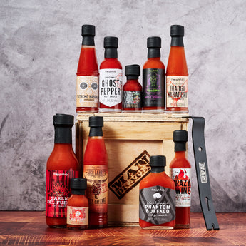 10 GOURMET HOT SAUCE BOTTLES – Includes a curated variety of USA-made hot sauces in assorted bottle shapes and sizes, from mild Smoky Bourbon to fiery Ghost Pepper blends.