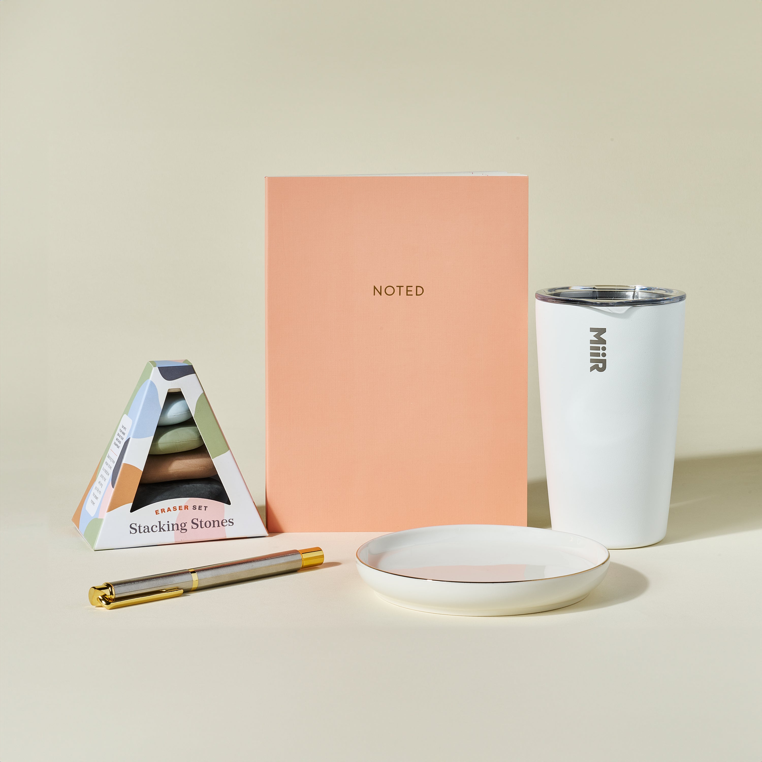 Know someone who enjoys updating their desk decor? This gift set includes a fun assortment of colorful and useful office items to make the workday a little nicer. This cheerful gift set includes a white insulated stainless steel tumbler and a trinket tray. To keep track of life, the gift also includes a pink "Noted" softcover journal and a deluxe silver metal ink pen.