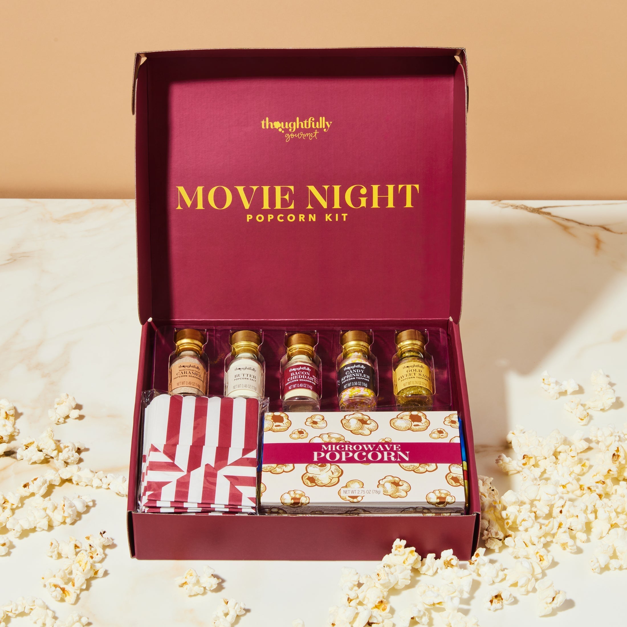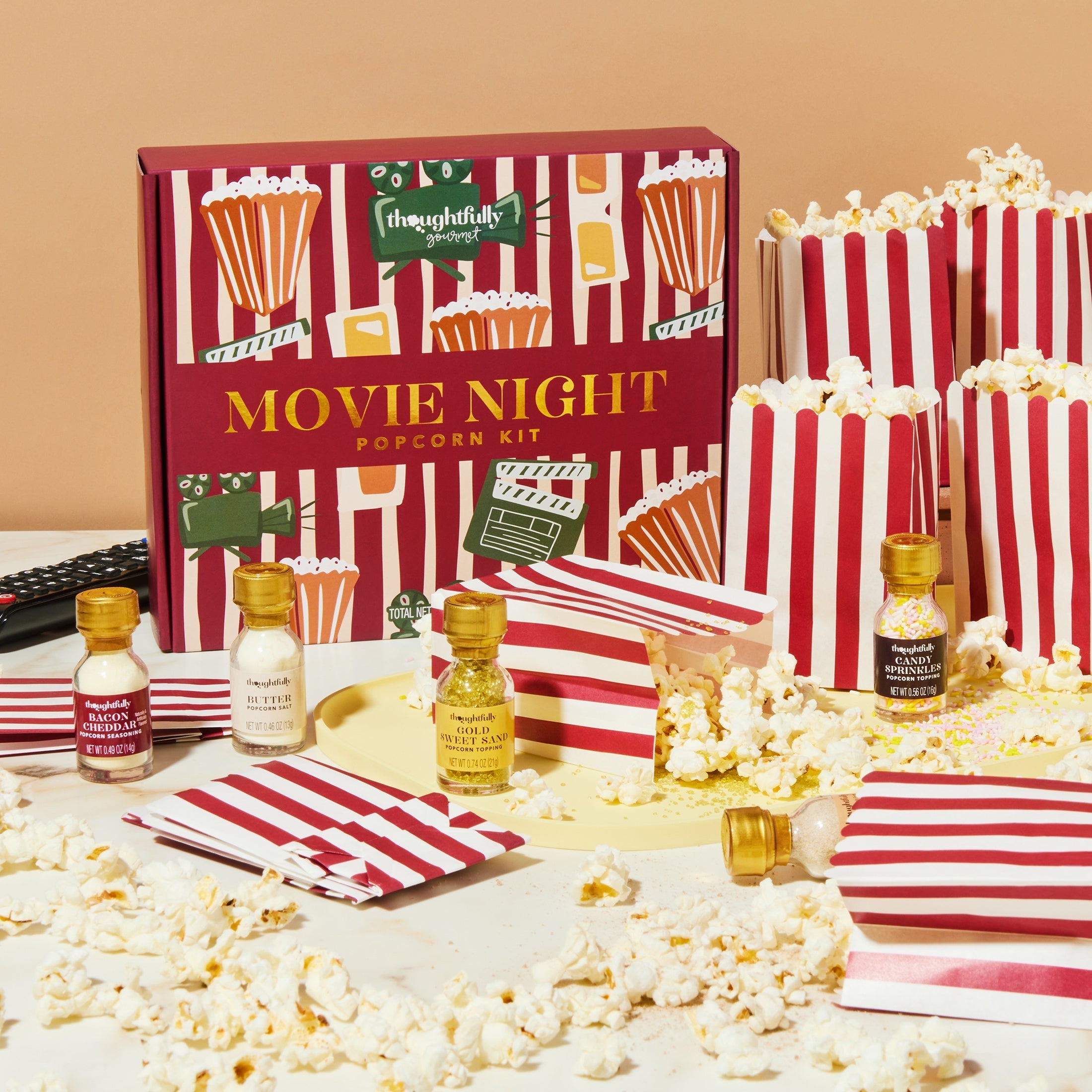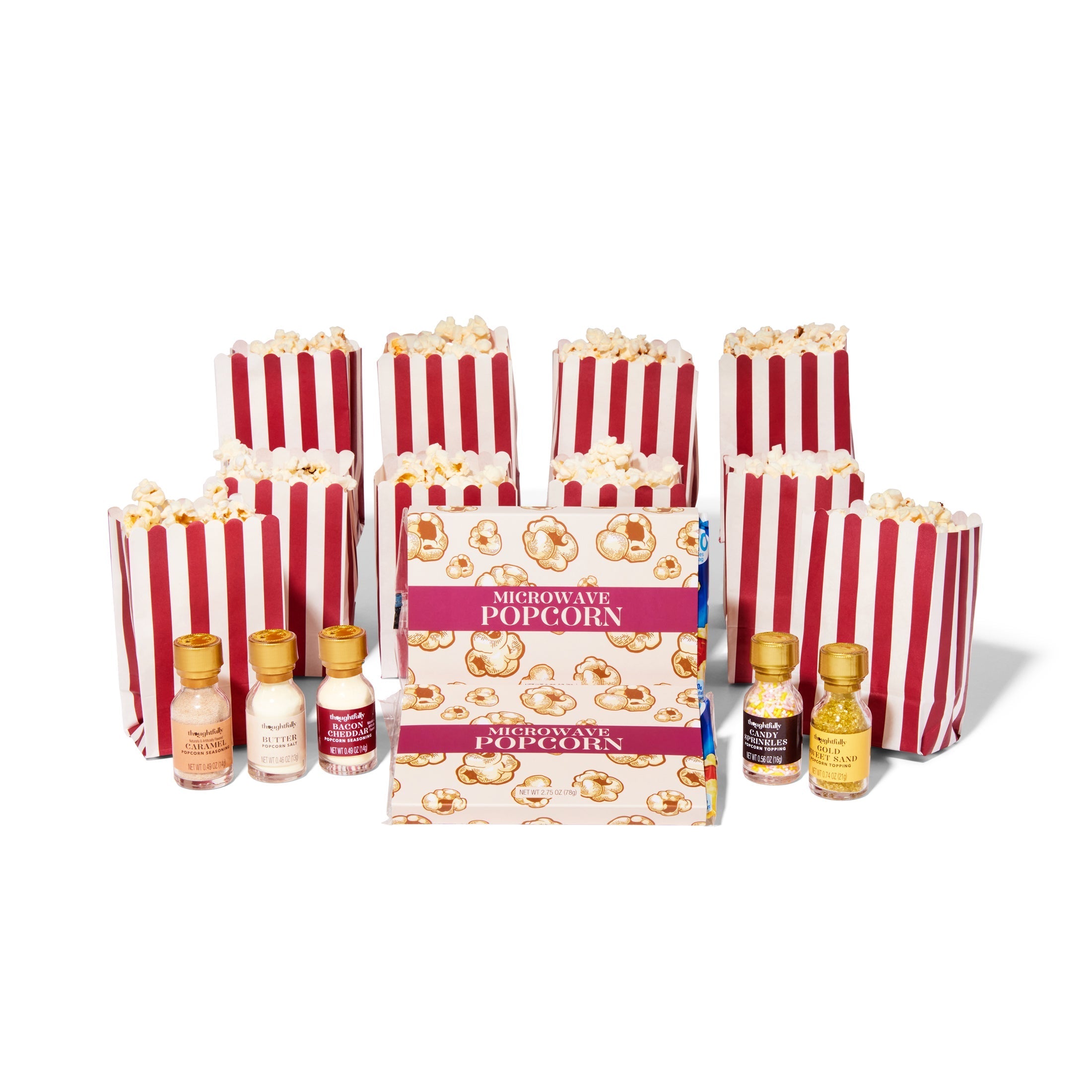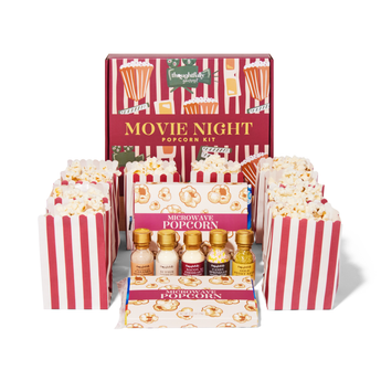 Make it a movie night to remember with the best popcorn seasoning set from Thoughtfully. Each set comes with 2 bags of microwave popcorn, 10 theater-style popcorn bags, and a selection of popcorn toppings that include candy sprinkles, Gold Sweet Sand and 3 different USA popcorn seasoning flavors: Bacon Cheddar, Caramel and Butter Salt Popcorn Seasoning. This popcorn gift set delivers a premium theater experience in the comfort of your own home.