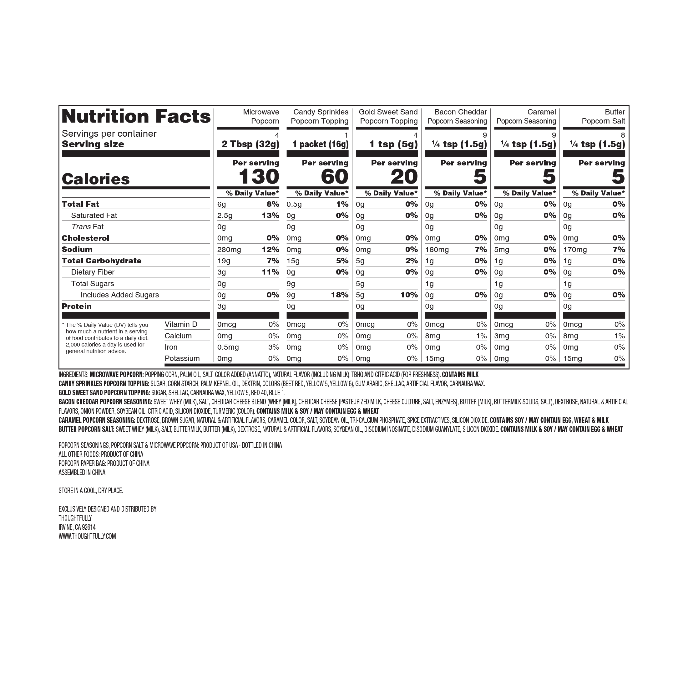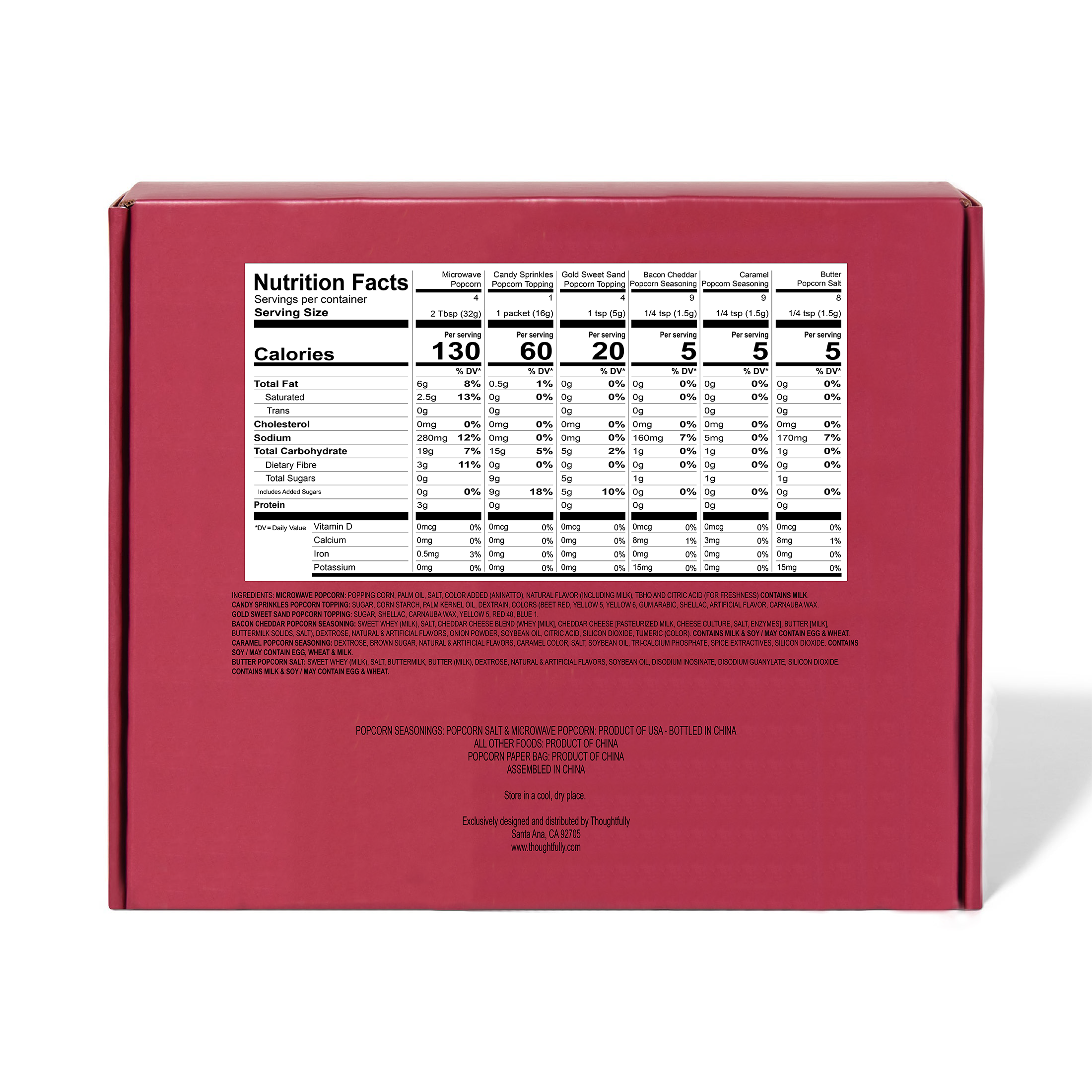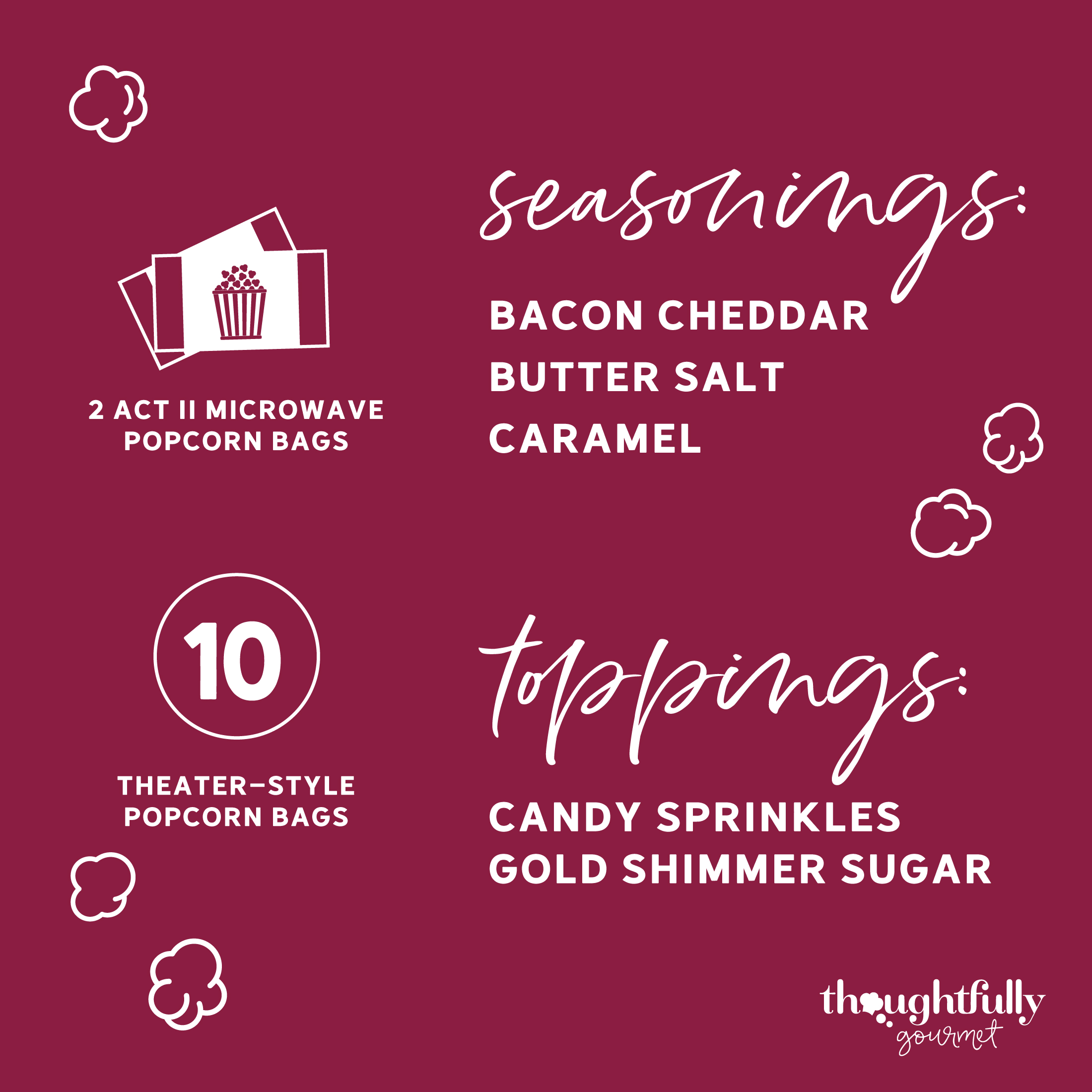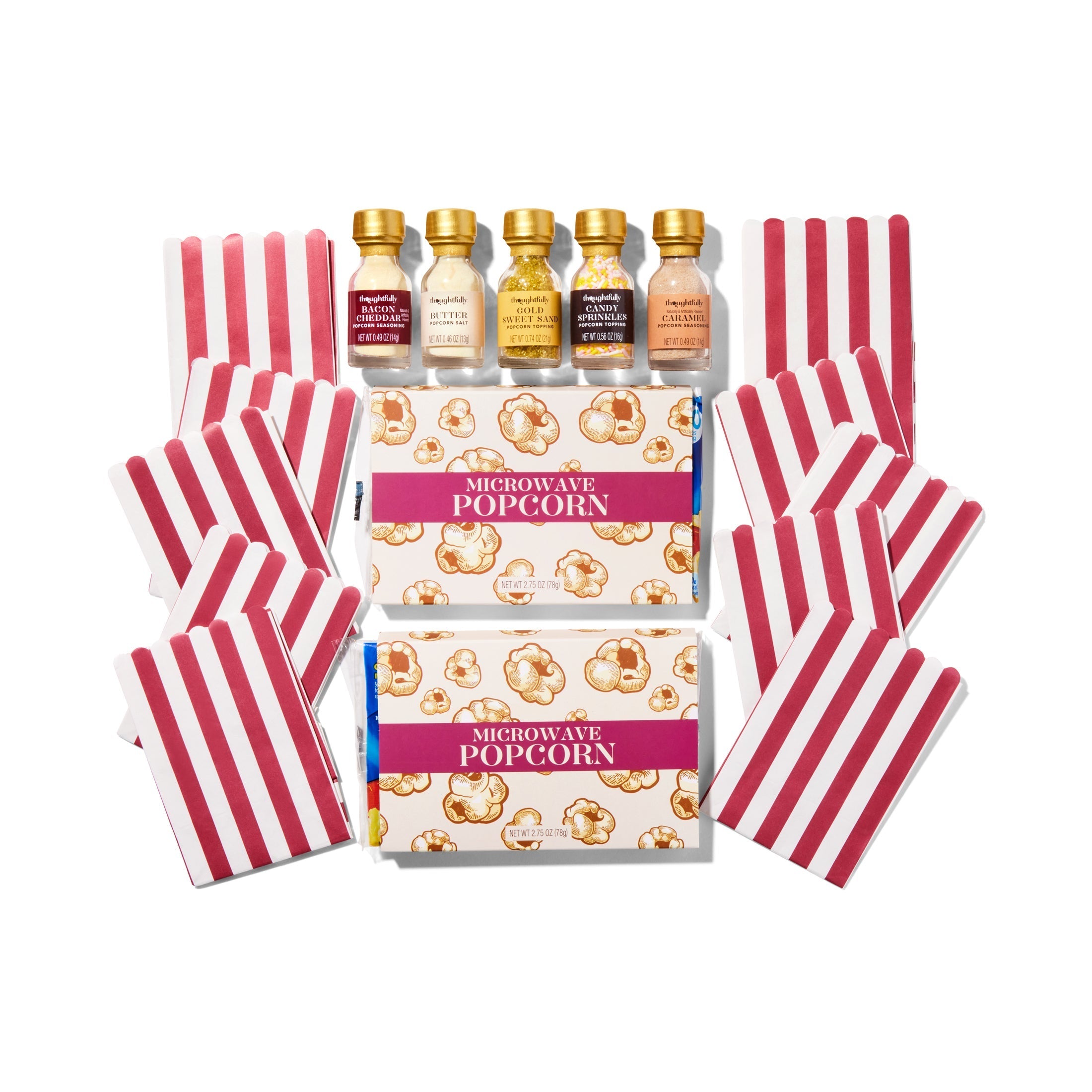 Make it a movie night to remember with the best popcorn seasoning set from Thoughtfully. Each set comes with 2 bags of microwave popcorn, 10 theater-style popcorn bags, and a selection of popcorn toppings that include candy sprinkles, Gold Sweet Sand and 3 different USA popcorn seasoning flavors: Bacon Cheddar, Caramel and Butter Salt Popcorn Seasoning. This popcorn gift set delivers a premium theater experience in the comfort of your own home.