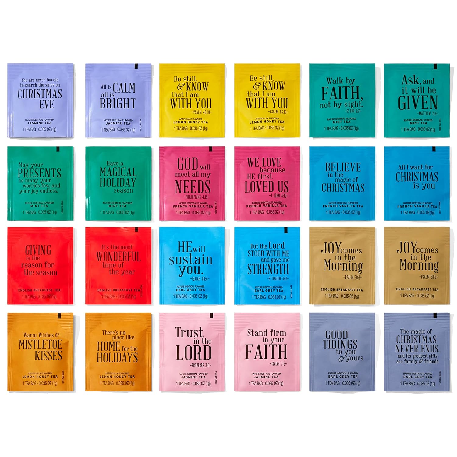 Celebrate the season with our Oh Holy Night 24 Days of Christmas Tea Advent Calendar, a delightful way to count down to Christmas with 24 deliciously soothing teas from Sri Lanka. Enjoy classic flavors like Mint, Earl Grey, French Vanilla, Lemon Honey, Jasmine, and English Breakfast, each crafted to warm your heart and spirit. Every tea bag features one of 24 uplifting Christian quotes, reminding you of the true reason for the season. Designed to hang beautifully on any wall, it adds a festive touch of holiday décor to your home. Thoughtfully packaged and gift bag ready, this Christmas tea set makes a perfect present for tea lovers and anyone who cherishes peaceful holiday moments.