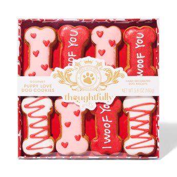 Whether you’re training your dog with a dog treat or celebrating their next big puppy milestone, pamper your pup with Puppy Love Dog Cookies. Made with human grade ingredients, each set includes 8 hand-decorated, bone-shaped dog treats with “I Woof You” written in dog friendly frosting. These ginger-flavored gourmet dog treats also make an excellent gift for Valentine’s Day or Happy Gotcha Day.