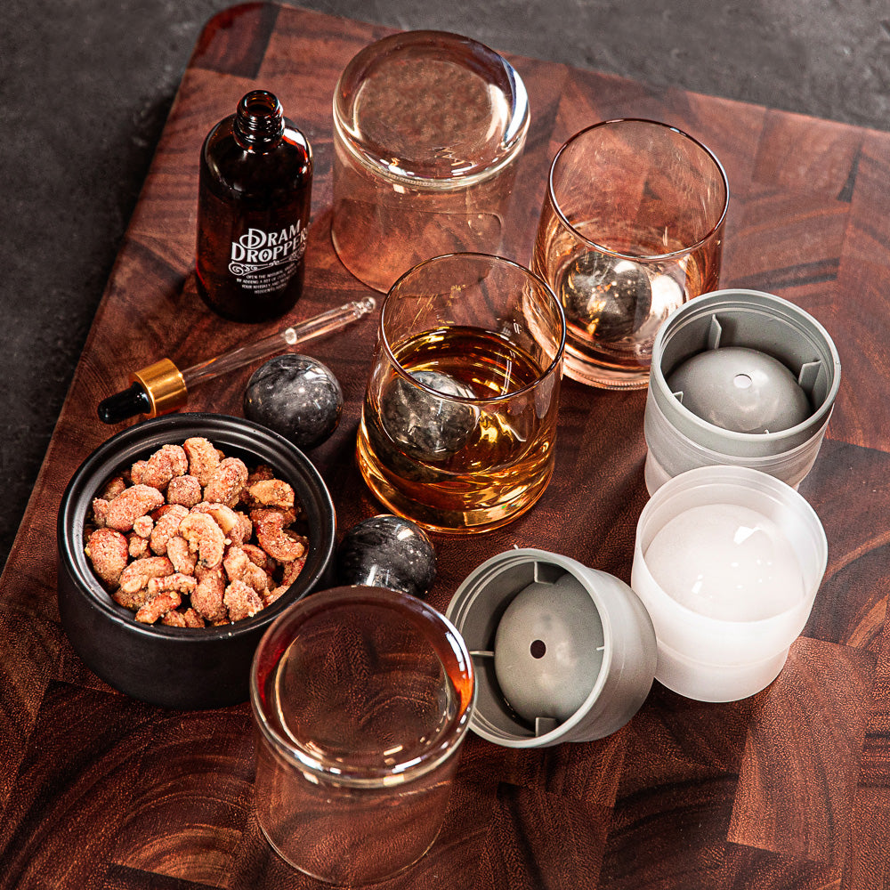 These Man Crates Exclusive whiskey glasses were designed to show off his sophisticated style. Subtly engraved on the underside for maximum elegance, they’re perfect for the guy who expects his drink to be as put together as he is. Large ice sphere molds, and quality whiskey stones provide two ways to keep his whiskey cool, and a handful of roasted peanuts make the perfect compliment to any whiskey.